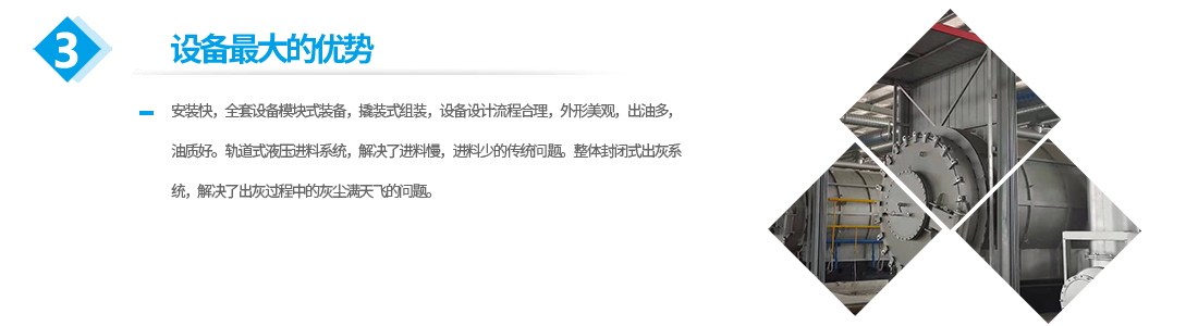公司生產(chǎn)的設備的優(yōu)勢:安裝快,全套設備模塊式裝備,撬裝式組裝,設備設計流程合理,外形美觀,出油多,油質(zhì)好。軌道式液壓進料系統(tǒng),解決了進料慢,進料少的傳統(tǒng)問題。整體封閉式出灰系統(tǒng),解決了出灰過程中的灰塵滿天飛的問題。